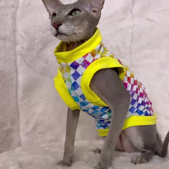 A handmade shirt for your feline family member! Mad Sphynx Design offers a unique shirt with wider neck and arm openings to allow the greatest range of motion for the laziest or most active cats.