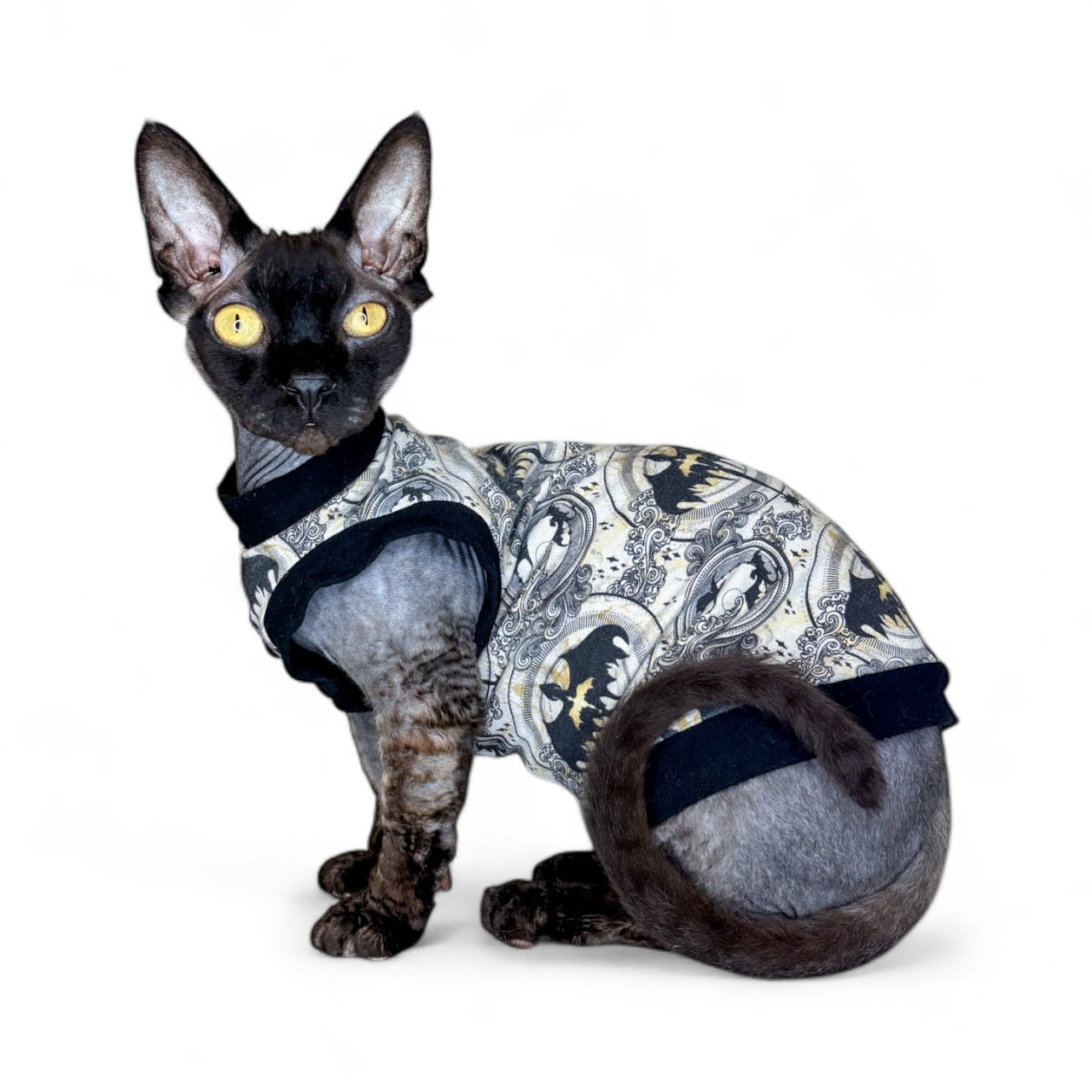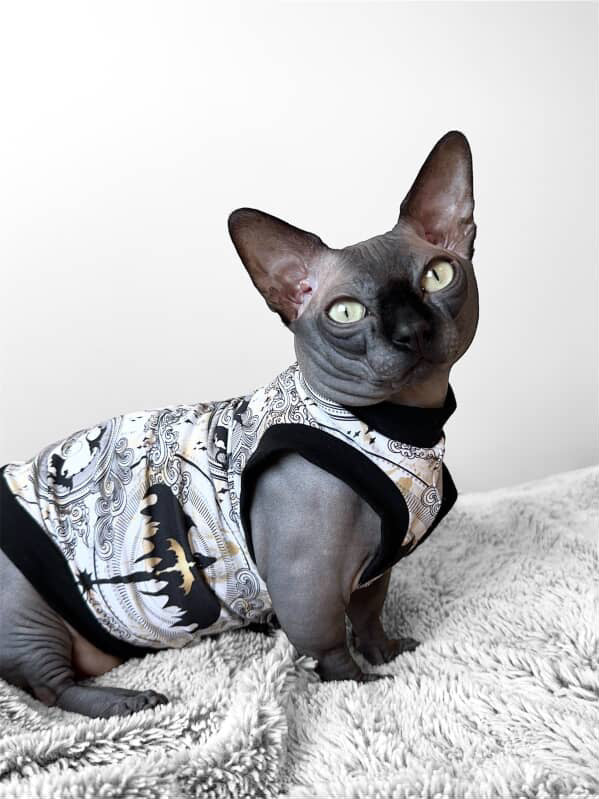 A handmade shirt for your feline family member! Mad Sphynx Design offers a unique shirt with wider neck and arm openings to allow the greatest range of motion for the laziest or most active cats.