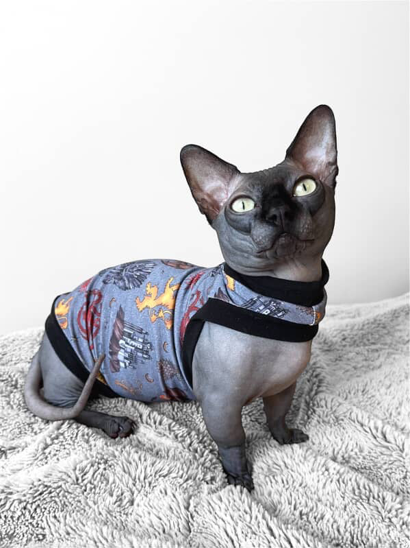 A handmade shirt for your feline family member! Mad Sphynx Design offers a unique shirt with wider neck and arm openings to allow the greatest range of motion for the laziest or most active cats.