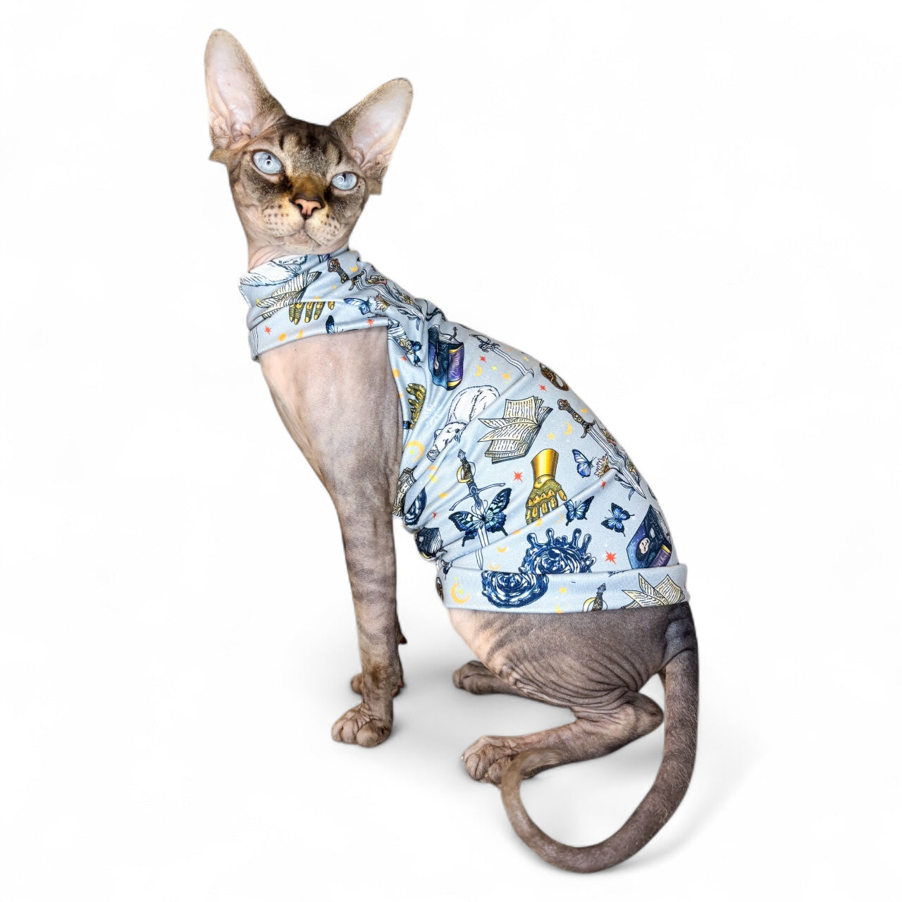 A handmade shirt for your feline family member! Mad Sphynx Design offers a unique shirt with wider neck and arm openings to allow the greatest range of motion for the laziest or most active cats.