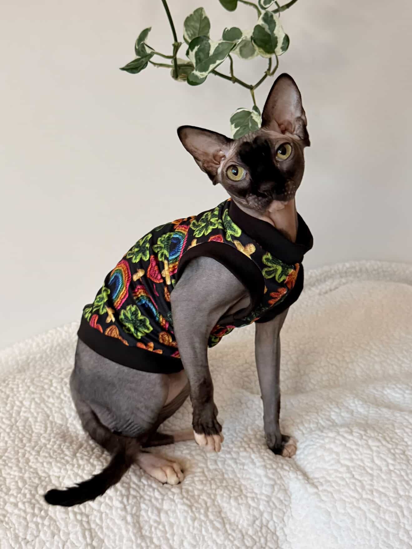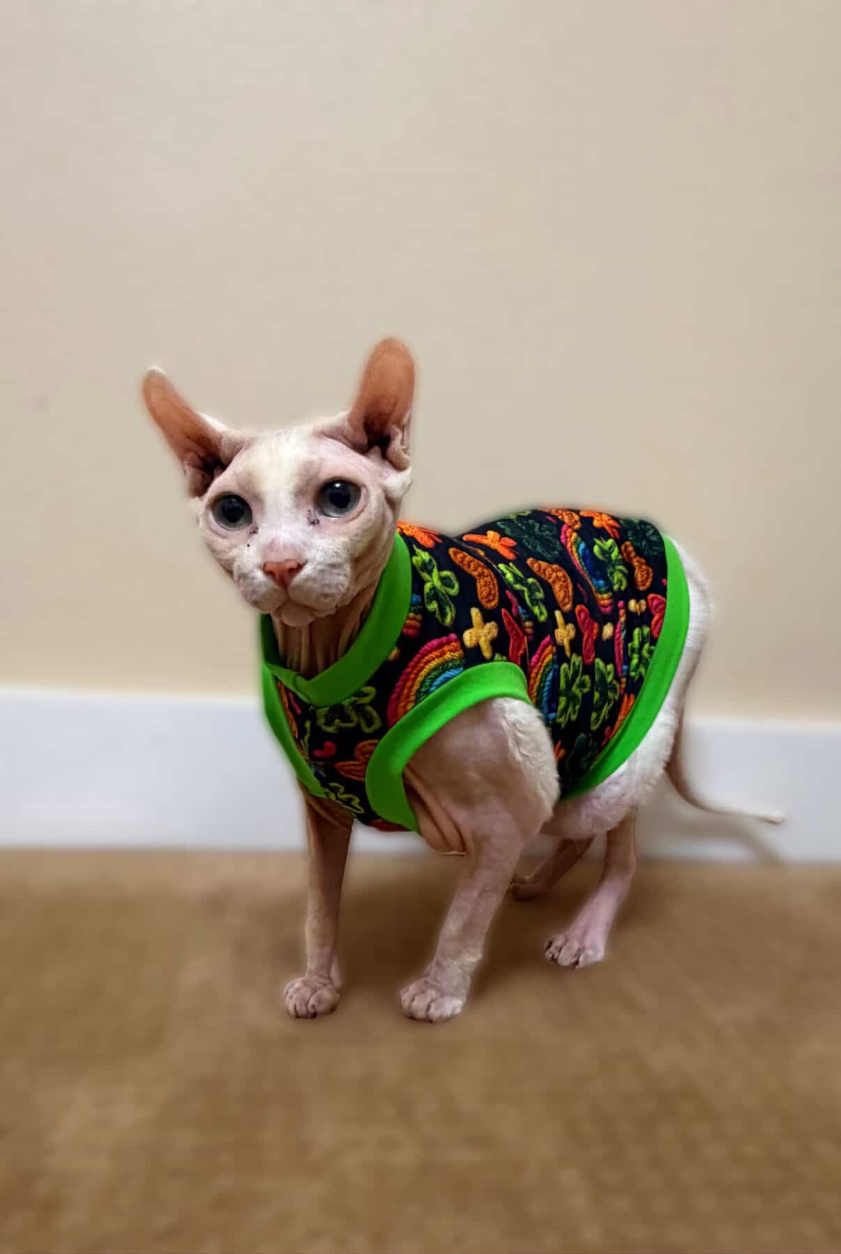 A handmade shirt for your feline family member! Mad Sphynx Design offers a unique shirt with wider neck and arm openings to allow the greatest range of motion for the laziest or most active cats.