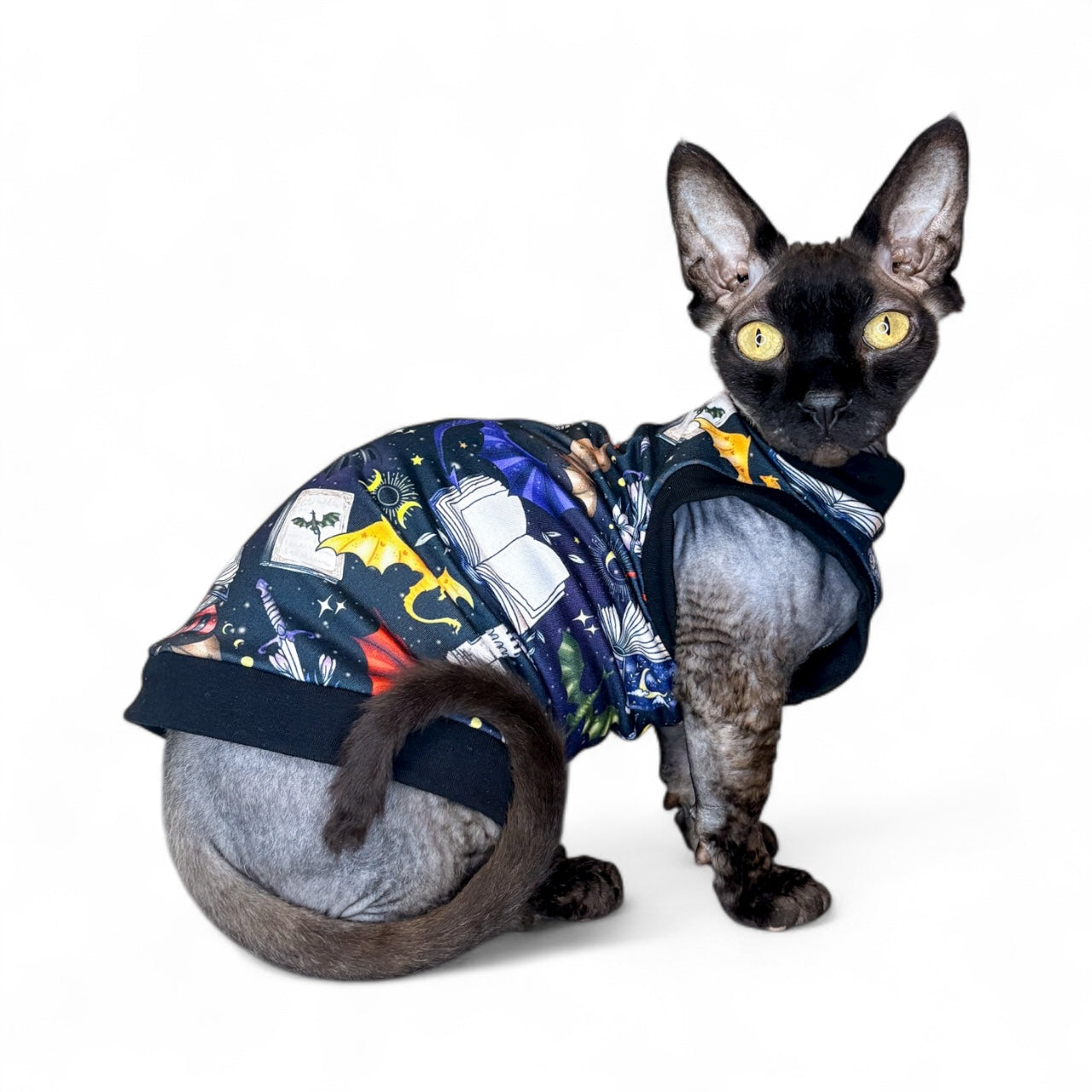 A handmade shirt for your feline family member! Mad Sphynx Design offers a unique shirt with wider neck and arm openings to allow the greatest range of motion for the laziest or most active cats.